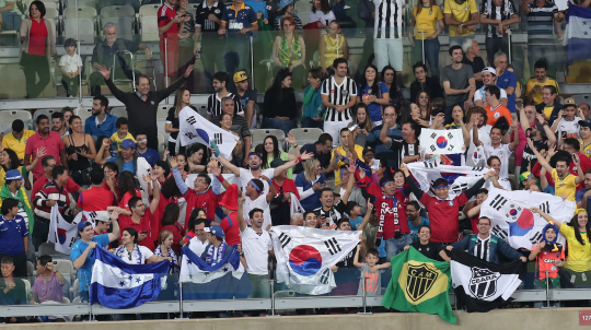 브라질 팬심은 '꼬리아(한국)였다. 온두라스에 야유가 잦았다. 이유가 있었다. 별이 새겨진 온두라스의 국기가 벨로오리존치를 연고로 하는 아틀레티코 미네이루의 라이벌인 크루제이루의 엠블렘과 비슷해서다. 크루제이루 엠블럼은 푸른색과 흰색 그리고 별5개의 조합이다. 온두라스 국가가 나올 때는 야유가 쏟아지기도 했다. 후반 15분 온두라스 엘리스의 선제골이 터지자 '꼬리아'를 연호하는 함성이 더 커졌다.