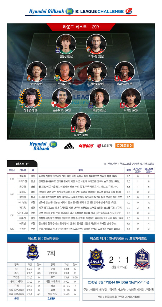 한편, 챌린지(2부 리그) 29라운드 MVP는 정승용(강원)이 차지했다. 챌린지 베스트11에는 정승용을 비롯해 김동섭 배승진(이상 안산) 크리스찬 송수영 정현철(이상 경남) 루이스(강원) 바그닝요 이학민 류원우(이상 부천) 닐손주니어(부산)이 선정됐다.