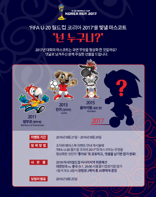 FIFA U-20월드컵조직위원회(이하 조직위)는 21일부터 24일까지 페이스북 페이지(facebook.com/u20korea)를 통해 '마스코트, 넌 누구니?' 이벤트를 실시한다. 영상과 이미지에 나타난 실루엣을 보고 2017년 대회의 마스코트가 무엇을 형상화한 것인지 맞히는 이벤트다. 공개된 영상에서는 2011년 콜롬비아, 2013년 터키, 2015년 뉴질랜드 대회의 마스코트인 밤부코(앵무새), 칸키(강아지), 울아이엠(검은 양)이 담겨있으며 마지막으로 FIFA U-20 월드컵 마스코트 형체가 그려져 있다.