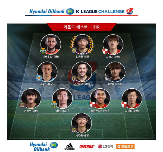 한편, 안산전에서 1골-2도움을 기록했던 대전 공격수 김동찬은 챌린지(2부리그) 31라운드 MVP에 선정됐다. 챌린지 31라운드 베스트11에는 김동찬을 비롯해 박주원 이동수 구스타보(이상 대전) 마테우스 이한샘(이상 강원) 최광희 닐손주니어 고경민(이상 부산) 알렉스(대구) 최오백(서울 이랜드)이 뽑혔다.