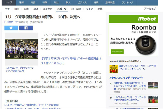 내년 J리그 시즌부터 우승상금을 대폭 늘리는 방안을 추진 중이다. 닛칸스포츠 등 일본 언론들은 10일 '내년부터 J1리그가 단일시즌제를 실시하면 우승상금이 10억엔(약 107억원)을 지급할 방침인 것으로 나타났다'고 보도했다.