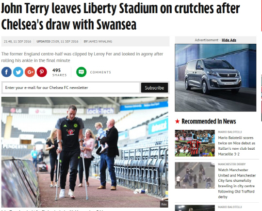 영국 언론들은 11일(현지시각) 테리의 사진 한 장을 올렸다. 테리가 목발을 짚은 채 스완지시티의 리버티 스타디움을 떠나는 사진이었다. 왼쪽 발에는 붕대를 감고 있었다. 테리는 11일 스완지시티와의 2016~2017시즌 잉글랜드 프리미어리그(EPL) 4라운드 원정경기에 풀타임 출전했다. 경기는 2대2로 비겼다. 테리는 경기 도중 르로이 페르와 충돌하며 고통을 호소하기도 했다.