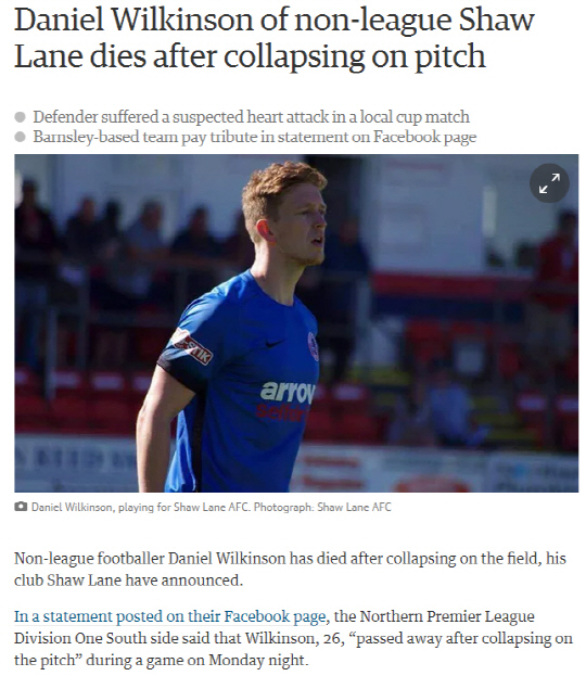 영국 일간지 가디언은 14일(한국시각) '쇼레인AFC 소속 수비수 대내얼 윌킨슨이 13일 열린 브릭하우스와의 8부리그 컵대회 도중 갑자기 쓰러져 병원으로 이송됐으나 결국 사망했다'고 전했다. 이 신문은 '윌킨슨은 쓰러진 뒤 구급차 도착 전까지 의료진으로붜 심폐소생술을 받았지만 호흡이 돌아오지 않았다'고 덧붙였다.