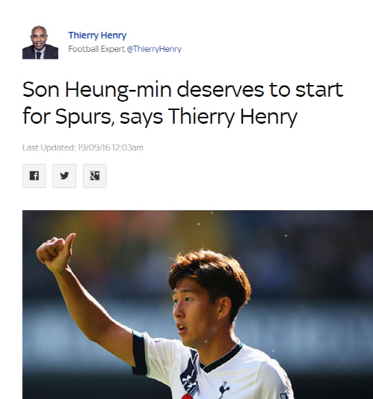 티에리 앙리가 선덜랜드전 손흥민(24·토트넘)의 활약을 극찬했다.