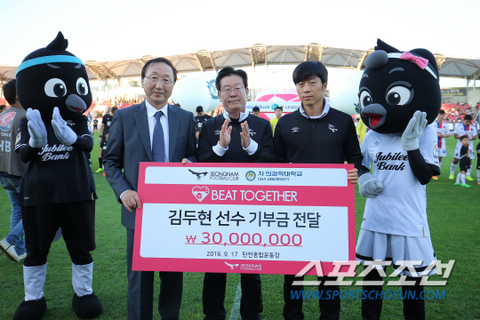 김두현은 "병마와 싸우시는 환우들을 위해 조금이나마 힘이 되고자 기부를 결심했다. 축구 선수로 많은 사랑을 받은 만큼 어려움을 겪는 분들께 보답하고 싶다. 꼭 완치돼서 성남FC 경기도 보러오고 더 행복한 삶을 누렸으면 좋겠다"고 소감을 밝혔다.