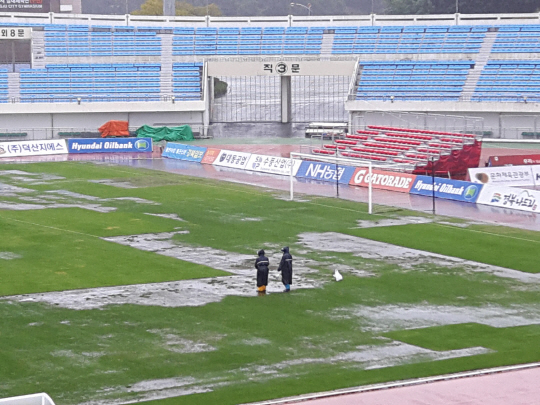 경기장 잔디 개보수가 마무리 되지 않은 그라운드에 장대비가 내리면서 엉망이 되자 한국프로축구연맹(이하 프로연맹)이 대회 규정 30조 2항(경기장 준비부족, 시설미비 등 점검미비에 따른 홈팀의 귀책 사유로 인하여 경기 개최 불능, 또는 중지-중단 되었을 경우, 재경기는 원정팀 홈구장에서 개최한다)에 따라 하루 뒤인 18일로 경기 연기를 선언했다.