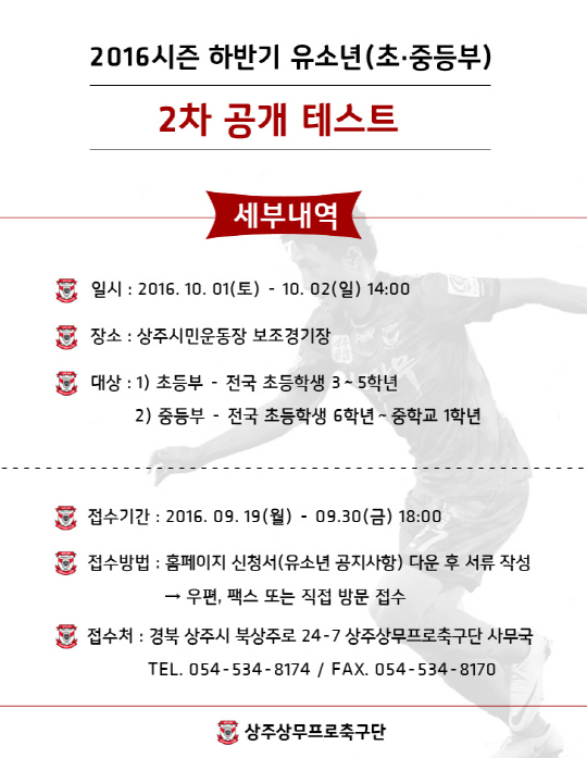초등부는 전국의 초등학생 3학년에서 5학년을 대상으로 하며, 중등부는 전국 초등학생 6학년부터 중학교 1학년까지 지원이 가능하다. 공개테스트는 상주시민운동장 보조경기장에서 10월 1일부터 2일까지 기존 유소년 팀의 훈련시간에 맞춰 진행된다. 테스트는 개별 몸풀기 운동 이후 순발력, 지구력, 드리블 등 기본기와 기초체력 테스트를 실시하며, 자체 게임을 통해 인재를 선발할 예정이다.