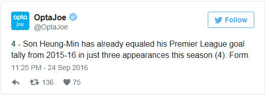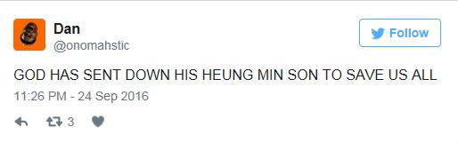 프리미어리그 팬들은 손흥민(토트넘)의 미친 활약에 가레스 베일과 메시를 떠올렸다. 손흥민은 24일(한국시각) 영국 미들즈브러 리버사이드 스타디움에서 열린 2016~2017 잉글랜드 프리미어리그(EPL) 6라운드 원정에서 나홀로 2골을 터뜨리며 2대1 승리를 이끌었다. 전반 7분 빈센트 얀센의 패스를 받아 왼발로 선제골을 기록했고, 전반 23분 페널티 지역 왼쪽에서 중앙으로 공을 몰고 나오며 기습적인 오른발 중거리 슈팅을 성공시켰다. 해리 케인의 공백은 없었다. 손흥민 세상이었다. 지난 시즌 4골을 기록한 손흥민이 시즌초반 2경기에서 4골을 뽑아냈다. 토트넘 팬들이 난리가 났다. 손흥민의 '미친' 활약에 "지난 시즌, 그 선수가 맞냐"며 기분좋은 농담을 던지고 있다.유로스포츠는 25일(한국시각) 손흥민의 활약에 대한 팬들의 실시간 SNS 반응들을 모아 공개했다.