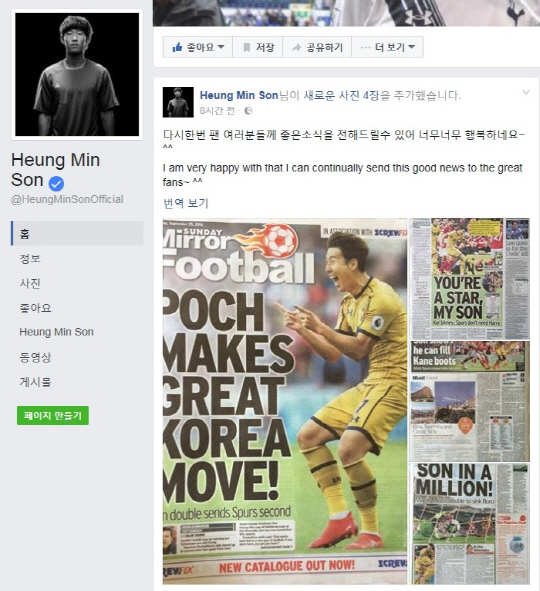 손흥민도 이같은 관심에 대해 감사를 전했다. 그는 자신의 공식 페이스북 계정에 신문들을 찍어올린 뒤 '다시한번 팬 여러분들께 좋은소식을 전해드릴수 있어 너무너무 행복하네요~ ^^'라며 기뻐했다.