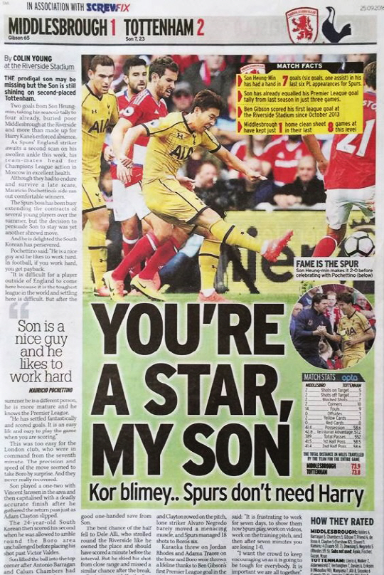 메일 온 선데이도 '손흥민이 케인의 자리를 메울 수 있다는 것을 보여줬다'며 손흥민의 골 장면을 크게 실었다. 데일리스타도 '백만 파운드짜리 손!'이라며 '마법사 (손흥)민이 두 골을 넣으며 미들스브러를 침몰시켰다'고 표현했다.