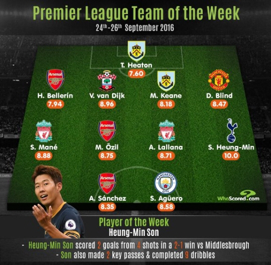 주간 베스트11에는 최전방에 알렉시스 산체스(아스널), 세르히오 아게로(맨시티), 미드필드에는 손흥민부터 애덤 랄라나, 사디오 마네(리버풀), 메주트 외질(아스널), 포백은 달레이 블린트(맨유), 마이클 킨(번리), 버질 반 다이크(사우스햄턴), 헥토르 베예린(아스널), 골키퍼는 톰 히튼(번리)가 선정됐다.