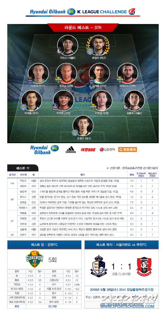 37라운드 베스트11엔 세징야를 비롯해 주민규 김봉래(이상 이랜드) 남준재 김재웅(이상 안산) 루이스 마테우스 이한샘(이상 강원) 박태홍 조현우(이상 대구) 박태형(고양)이 선정됐다. 강원이 베스트팀으로 꼽혔고 이랜드-부천전이 베스트 매치로 선정됐다.