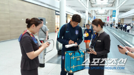 이란행 비행기를 기다리는 순간에도 A대표팀에 쉼표는 없었다. 모두 제각각의 사유로 '바쁜' 대기시간을 보냈다. 손흥민은 팬들에게 둘러쌓였다. 한 걸음 내딛으려 하면 사인 요청, 또 한 걸음 뻗으려 하면 사진 요청이 쇄도했다. 피곤할 법도 하지만 구김살 없는 미소로 팬들을 맞이했다.