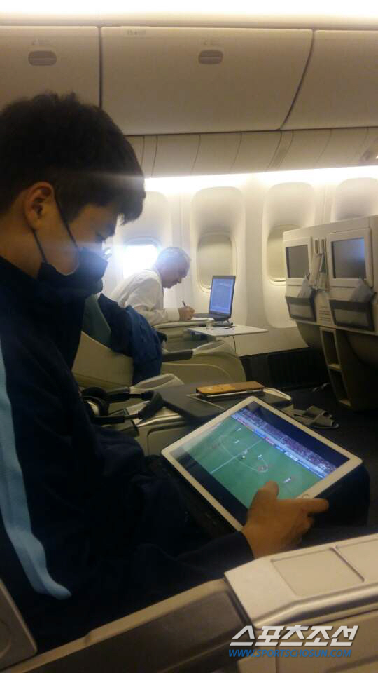 비즈니스석에 자리한 슈틸리케 감독. 잠시도 눈을 붙이지 않았다. 공언대로 슈틸리케 감독은 카타르와의 3차전 복기는 분석은 물론, 이란의 경기들을 세심히 살펴보며 이란전 필승전략을 구상했다. 슈틸리케호의 캡틴 기성용도 함께였다. 2009년과 2012년에 이어 세 번째 이란 원정에 나선 기성용이다. 그는 "이번만큼은 이란을 이길 수 있지 않겠나"라고 했다.