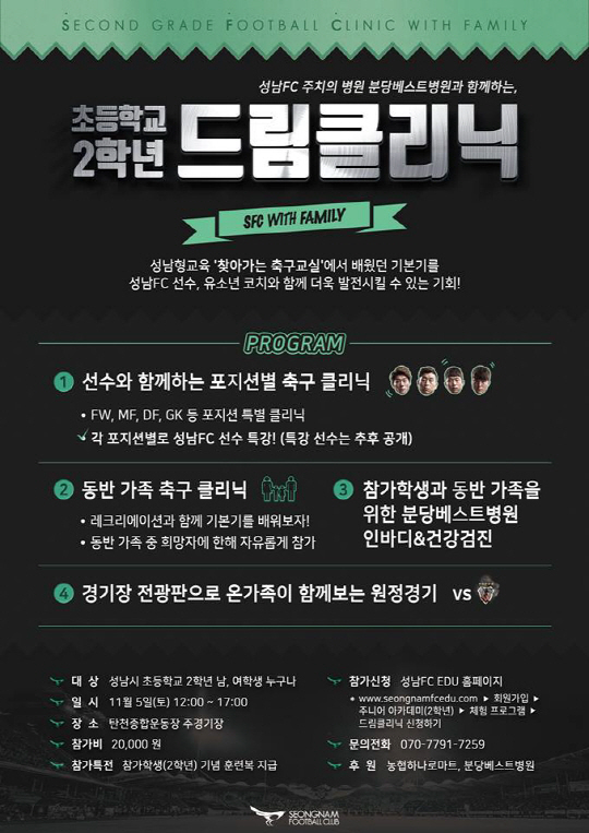 이번 드림클리닉은 성남FC의 EDU홈페이지(seongnamfcedu.com)에서 신청 가능하다.