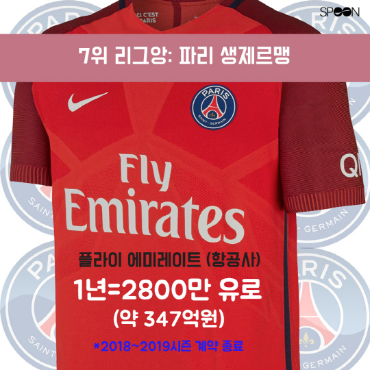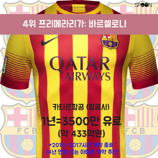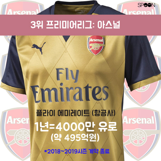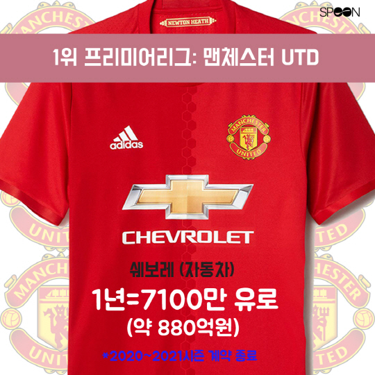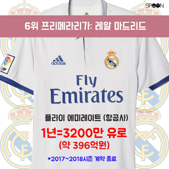 축구 산업 전문 매체인 '파이낸스 풋볼'이 발표한 자료를 바탕으로 2016~2017시즌 최상위 '메인 스폰서' 계약을 체결한 상위 7개 팀과 그들이 1년에 받는 금액, 계약기간을 알아봤다.