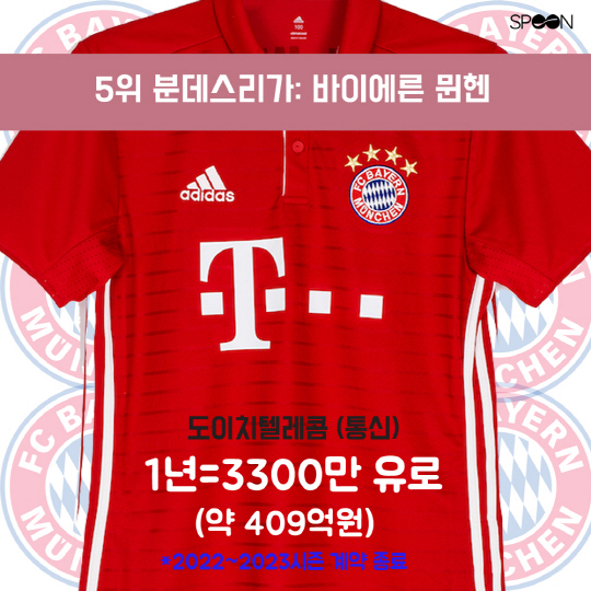 세계적으로 많은 팬을 보유한 유럽축구 클럽은 유니폼 상의에 기업의 로고나 제품명을 넣은 조건으로 천문학적인 액수를 받는다. 유럽 5대 빅리그 팀 가운데 가장 많은 금액을 받는 클럽은 어디일까?