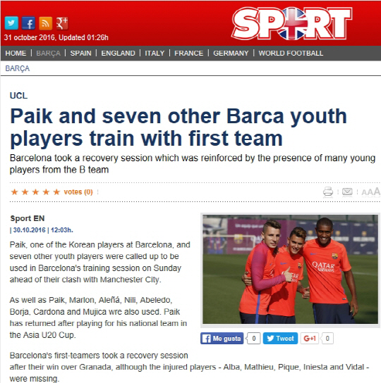 31일(한국시각) 스페인 일간지 스포르트는 '한국 출신 백승호가 알레냐, 마르론, 닐리 등 7명의 동료와 함께 맨시티와의 유럽챔피언스리그 조별리그 경기를 앞두고 1군 훈련을 소화했다"고 보도했다.
