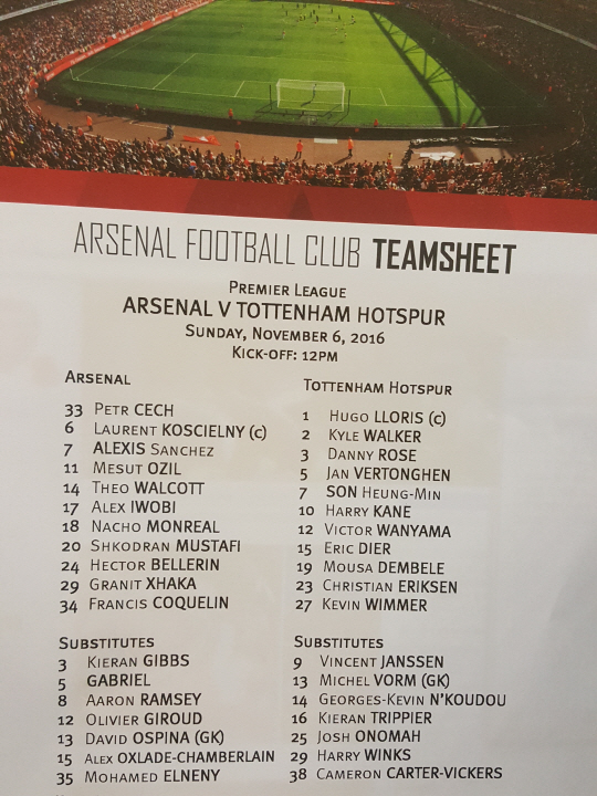 토트넘은 6일 아스널과의 2016~2017시즌 잉글랜드 프리미어리그(EPL) 11라운드 원정경기 1시간 전 선발 명단을 발표했다. 손흥민은 왼쪽 날개로 선발 출전했다.