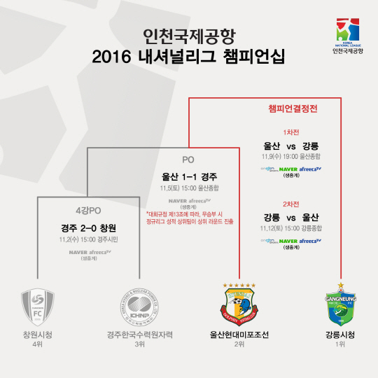 울산현대미포조선은 9일 울산종합운동장에서 열린 강릉시청과의 2016년 인천국제공항 내셔널리그 챔피언결정 1차전에서 1대0으로 이겼다. 울산현대미포조선은 1차전에서 귀중한 승리를 더하며 우승에 유리한 고지를 점했다. 2003년부터 2015년까지 치러진 13번의 챔피언결정전 중 1차전 승리팀이 우승트로피를 들어 올린 것이 무려 9번에 달한다. 울산현대미포조선은 2차전에서 비기기만 해도 우승을 거머쥘 수 있다. 올 시즌 내셔널리그 챔피언결정전은 두 경기 승점, 골득실로 승자를 정하고, 그래도 동률일때는 정규리그 순위로 우승팀을 가린다.