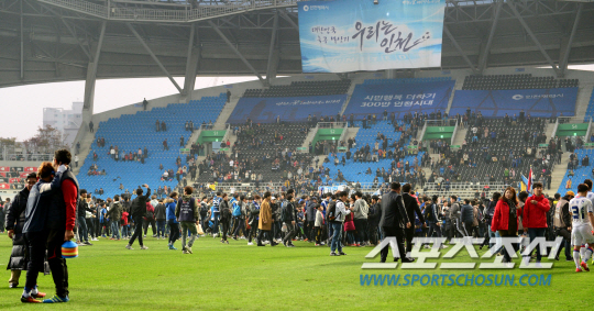 5일 오후 인천축구전용경기장에서 인천 유나이티드와 수원FC가 K리그 클래식 38라운드 최종전 경기를 펼쳤다. 인천이 수원FC에 1대0으로 승리하며 K리그 클래식 잔류를 확정했다. 경기 종료 후 그라운드에 내려온 팬들과 함께 우승의 기쁨을 나누고 있는 인천 선수들. 인천=송정헌 기자 songs@sportschosun.com