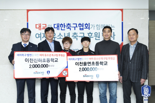 대한축구협회와 초중고 축구리그 후원사인 ㈜대교가 15일 2018년 러시아월드컵 최종예선 우즈벡전이 열린 서울월드컵경기장에서 여자 어린이 축구팀 후원금 전달식 행사를 실시했다.