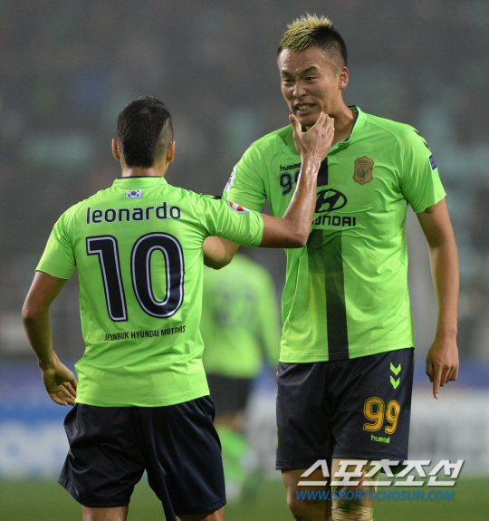최 감독은 분위기 반전을 위해 이동국을 투입한 전북은 승부를 원점으로 돌리는데는 6분밖에 걸리지 않았다. 후반 24분 아크 왼쪽에서 레오나르도의 호쾌한 오른발 중거리 슛이 그대로 골대로 빨려 들어갔다. 레오나르도는 전북 엠블렘을 가리키며 K리그를 대표해 ACL 결승을 오른 전북의 자랑스러움을 드러냈다.