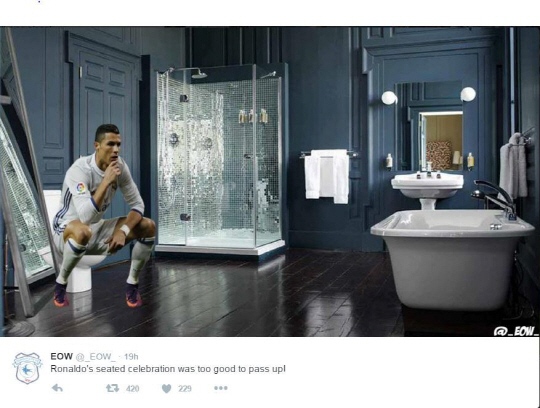 인터넷 상에서 화제가 됐다. 그리고 바로 패러디가 나왔다. 가장 호응이 큰 것은 '변기 위 호날두'였다. 변기 위에서 고뇌하고 있는 인간 군상의 포즈를 닮았다. 일본 스모 준비자세도 있었다. 여기에 리오넬 메시(바르셀로나) 사진과 절묘하게 합성해놓은 패러디도 있었다. 세리머니 하나로 새로운 세계를 창조한 호날두. 그는 역시 축구계 슈퍼 스타 중 한 명이었다.