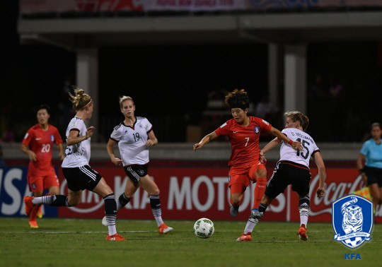 정성천 감독이 이끄는 U-20 여자대표팀은 21일(한국시각) 파푸아뉴기니 포트모르스비 국립경기장에서 열린 독일과의 2016년 국제축구연맹(FIFA) U-20 파푸아뉴기니여자월드컵 조별리그 D조 3차전에서 0대2로 패했다. 한국은 이날 패배로 1승2패 승점 3점을 기록해 조 3위로 처졌다. 같은 시각 조 최하위 베네수엘라를 3대2로 꺾으며 승점 6점을 얻은 멕시코가 조 2위, 독일(승점 9)이 조 선두로 8강에 올랐다.
