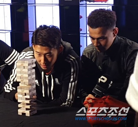 또 다른 녹화가 이어졌다. 보드 게임인 젠가를 하면서 인터뷰를 하는 토크쇼였다. 손흥민은 유독 손을 떨었다. 알고 보니 젠가가 처음이었다. 같이 하는 MC들이 빠르게 브릭을 뽑아내자 입을 벌리면서 놀라워했다. 자신이 브릭을 끄집어낼 때였다. 알리가 장난을 걸었다. 손흥민을 툭툭 쳤다. 그러자 "제발 그러지 마라"며 발끈하기도 했다. 툭탁대는 모습이 귀여웠다. 물론 결과는 '초보자' 손흥민의 패배였다. 손흥민은 "정말 처음이다. 그걸 감안해달라"며 귀엽게 투정을 부렸다.