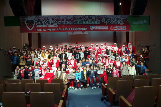 하얀 수염을 붙이고 빨간 산타 옷을 갖춰 입은 포항 선수단은 구룡포 읍민복지회관 대강당에서 어린이들을 만났다. '구룡포 초록우산 드림 오케스트라'의 환영 공연을 함께 관람한 일일 산타들은 사전에 어린이들이 작성한 '소원지'에 맞춰 준비한 선물을 전달하였다. 각자가 빌었던 소원의 선물을 품에 안은 어린이들의 함박 웃음으로 대강당은 가득 찼다.