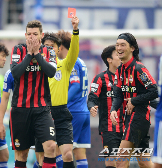 더 큰 문제는 그 다음이었다. 전반 43분 다카하기가 이종성(수원)에 앞서 태클로 볼을 따냈다. 누가 봐도 흠없는 깔끔한 태클이었다. 그러나 김 주심의 눈은 달랐다. 파울 선언과 함께 옐로카드에 이어 레드카드를 다시 번쩍였다. 다카하기는 실소를 금치 못했다. 명백한 오심이지만 한 번 내린 판정은 번복되지 않았다. '보상 판정'이라는 의심의 눈초리를 거둘 수 없었다.