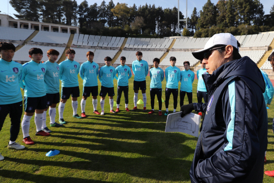 | 리스본국립경기장(포르투갈)/ U-20 대표팀 전지훈련/ 스크럼/ 작전지시/신태용 감독/ 사진 이완복 |