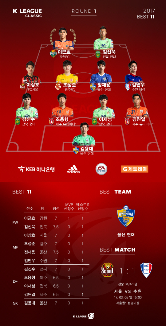 한편, 챌린지에선 이정협(부산)이 1라운드 MVP로 뽑혔다. 베스트11에는 이정협을 비롯해 김윤호(이상 부산) 말컴 박지수(이상 경남) 이승현 임창균 이상욱 (이상 수원FC) 바그닝요 박 민(이상부천) 금교진(서울 이랜드)가 선정됐다.