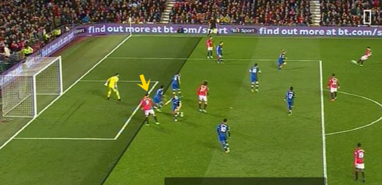TV 중계화면 리플레이로 보면 애슐리 윌리엄의 크로스 시점, 공이 발을 떠난 상황에서 즐라탄의 위치는 아슬아슬한 온사이드로 보인다.