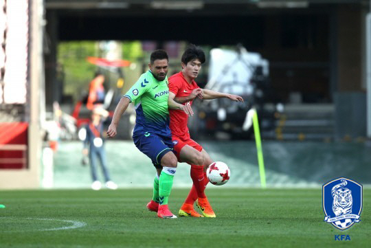 신태용호도 그냥 물러서지는 않았다. 역시 돋보인 선수는 이승우였다. 여독이 다 풀리지 않아 좋지 않은 컨디션이었음에도 가장 날카로운 모습을 보였다. 전반 1분 첫번째 슈팅을 날렸던 이승우는 14분 절묘한 감아차기 슈팅으로 골과 근접한 장면을 만들었다. 이승우는 몇차례 좋은 돌파를 선보이며 신태용호 에이스 다운 플레이를 펼쳤다. 조영욱과 백승호도 주눅들지 않았다.