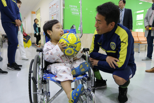 아산 무궁화(구단주 복기왕) 선수단은 어린이날을 맞아 병상에 있는 환아를 위해 위문에 나섰다.