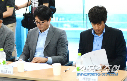 대한축구협회가 4일 오전 파주 축구 국가대표팀 트레이닝 센터(NFC)에서 A대표팀 감독과 U-23 대표팀 감독 선임을 위해 기술위원회를 열었다. 황선홍, 서정원 기술위원이 자료를 살펴보고 있다. 파주=정재근 기자 cjg@sportschosun.com/2017.07.04/ |