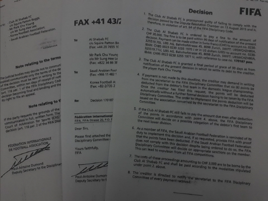 그 결정문의 골자 역시 알 샤밥은 박주영에게 90일 이내에 밀린 임금을 지불하라는 것이다. 그 데드라인이 이달 25일까지다. FIFA는 그 기간까지 체불 임금이 지불되지 않을 경우 박주영은 알 샤밥의 사우디리그에서의 승점 6점 감점을 요구할 수 있다. 박주영이 이 요청서를 FIFA에 제출할 경우 승점 6점은 자동으로 감점 처리된다. 승점 감점은 사우디축구협회가 실행하게 된다. FIFA는 사우디축구협회를 압박하고 있다. 알 샤밥에 대한 승점 감정을 이행하지 않을 경우 FIFA 징계위원회가 다시 적절한 제재 조치를 취할 수 있다고 명기했다. 사우디가 FIFA 주관 대회에 출전하지 못할 수 있다고 못박았다. 또 FIFA의 분쟁조정 지침을 이행하지 않은 알 샤밥에 벌금 3만 스위스프랑을 부과했다. 이 역시 90일 이내에 납부하라고 통보했다.