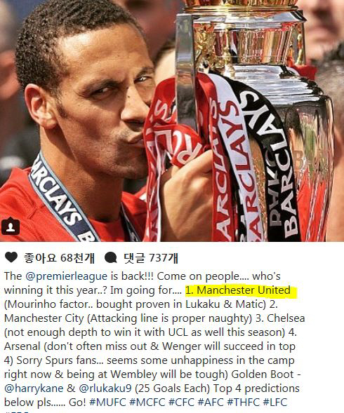 퍼디낸드는 12일(한국시각) 자신의 인스타그램을 통해 맨유의 우승을 예언했다. 맨유는 올시즌 여름 이적시장에서 1억4500만 파운드를 투자했다. 로멜루 루카쿠, 빅토르 린델로프, 네마냐 마티치 등 포지션별로 통큰 영입에 성공하며, 전력을 업그레이드했다. 퍼디낸드는 '무리뉴 효과(Mourinho factor)' 루카쿠, 마티치 영입에 힘입어 맨유가 올시즌 우승할 것이라고 단언했다.