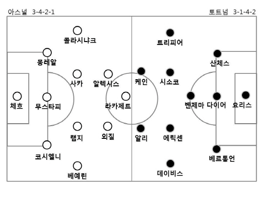 아스널은 점유율 극대화를 선택했다. 허리를 단단하게 했다. 사카와 램지 그리고 앞선에 있는 외질과 알렉시스 산체스가 존을 형성했다. 토트넘의 허리를 계속 공략했다. 토트넘이 자랑하는 역습 패스를 견제했다. 볼을 소유하면서 경기를 풀어나갔다. 여기에 아스널 선수들의 절박함이 더해졌다. 아스널 선수들은 뛰고 또 뛰었다. 활동량에서 큰 차이가 났다. 전반 5분 라카제트의 슈팅을 시작으로 해서 토트넘을 계속 몰아쳤다. 토트넘도 전반 15분 시소코가 올라오면서 반짝 주도권을 잡는 듯 했다. 그러나 거기까지였다. 안정적인 허리를 바탕으로 한 아스널이 경기의 주도권을 잡으며 계속 토트넘을 때렸다.