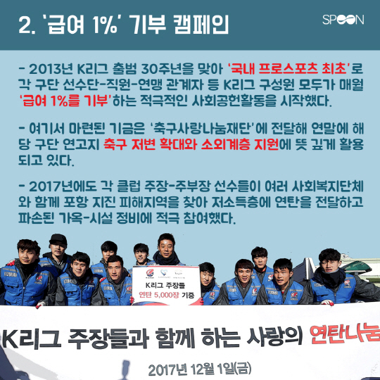 팬들의 사랑을 먹고 사는 K리그 각 구단을 비롯한 전 구성원은 사회공헌활동을 적극적으로 추친해 연고지 팬들에게 한 발짝 더 다가가기 위해 여러 노력을 하고 있다.
