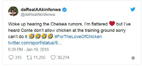 음식 문제 때문에 첼시에 입단할 가능성은 없다는 것이다. 아킨펜와는 자신의 트위터 계정에서 "(나를 영입하고 싶어한다는)첼시의 소문을 듣고 감사하게는 생각한다. 하지만 콘테 감독이 훈련장에서 치킨 음식을 허용하지 않는다는 소식을 들었다. 미안하지만 난 그런 조치를 받아들일 수 없다"고 말했다.
