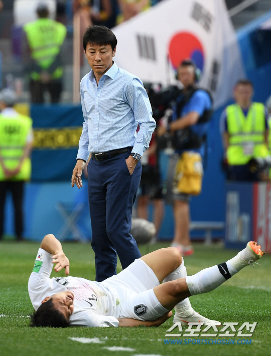 2018 러시아월드컵 한국과 스웨덴의 조별 예선 첫 경기가 18일 오후(한국시각) 러시아 니즈니 노브고로드 스타디움에서 열렸다. 박주호가 햄스트링 부상으로 쓰러지자 신태용 감독이 걱정스런 표정으로 보고 있다. 니즈니노브고로드(러시아)=정재근 기자 cjg@sportschosun.com/2018.06.18/