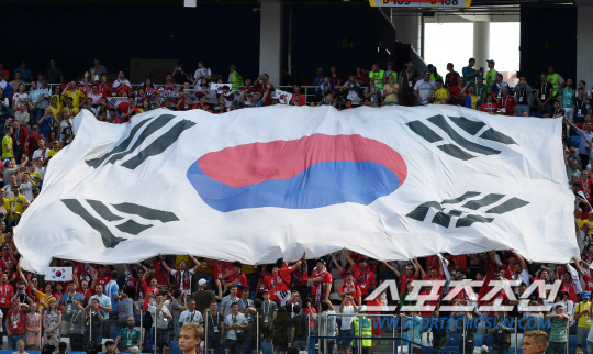 2018 러시아월드컵 한국과 스웨덴의 조별 예선 첫 경기가 18일 오후(한국시각) 러시아 니즈니 노브고로드 스타디움에서 열렸다. 관중석에 대형 태극기가 펼쳐지고 있다. 니즈니노브고로드(러시아)=정재근 기자 cjg@sportschosun.com/2018.06.18/