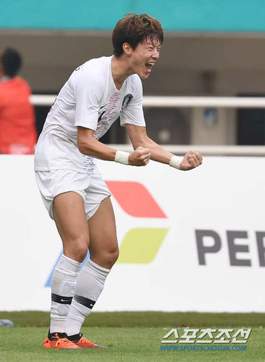 29일 오후 인도네시아 보고르 파칸사리 스타디움에서 '2018 자카르타 팔렘방 아시안게임' 남자 축구 4강전 한국과 베트남의 경기가 열렸다. 전반 한국 황의조가 두 번째 골을 성공시킨 후 김문환과 환호하고 있다.