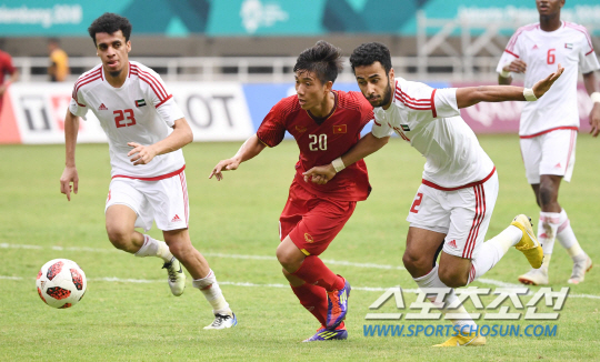 1일 오후 인도네시아 보고르 파칸사리 스타디움에서 '2018 자카르타 팔렘방 아시안게임' 남자 축구 3-4위전 베트남과 아랍에미리트의 경기가 열렸다. 양팀 선수들이 볼을 다투고 있다.