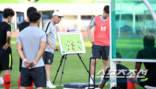 2018 자카르타-팔렘방 아시안게임 축구대표팀이 7일 오후 파주스타디움에서 인천대와 연습게임을 했다. 하프타임 때 김학범 감독이 작전지시를 하고 있다. 파주=정재근 기자 cjg@sportschosun.com/2018.08.07/
