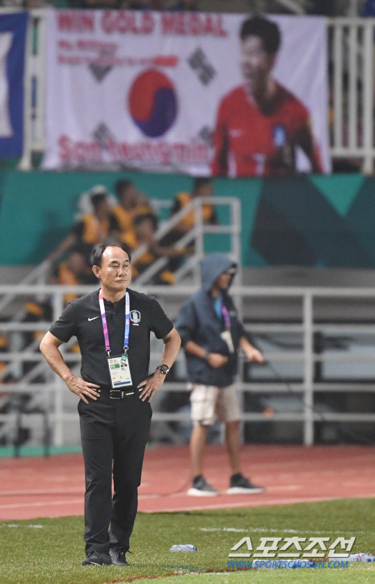 1일 오후 인도네시아 보고르 파칸사리 스타디움에서 '2018 자카르타 팔렘방 아시안게임' 남자 축구 결승전 한국과 일본의 경기가 열렸다. 한국 김학범 감독이 경기를 지켜보고 있다. 보고르(인도네시아)=김경민 기자 kyungmin@sportschosun.com /2018.09.01/