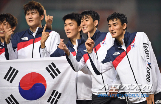 1일 오후 인도네시아 보고르 파칸사리 스타디움에서 '2018 자카르타 팔렘방 아시안게임' 남자 축구 결승전 한국과 일본의 경기가 열렸다. 연장 접전끝에 일본에 승리하며 금메달을 딴 한국 김민재, 황인범, 손흥민, 조유민 등 선수들이 시상식에서 환호하고 있다